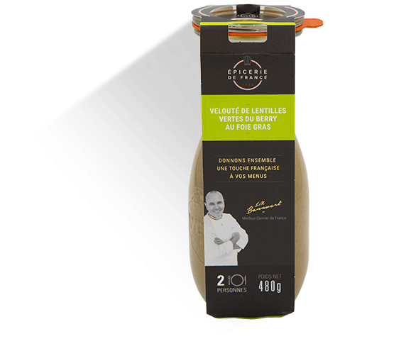Eau, lentilles vertes du Berry cuites 17%, foie gras de canard cuit 9% (dont foie gras de canard entier, Coteaux du Layon, Porto blanc, sucre, conservateur : nitrite de sodium, antioxydant : ascorbate de sodium), crème (lait, stabilisant : carraghénanes), carotte, oignon, poitrine de porc fumée, ail, amidon, arôme naturel, sel, poivre.